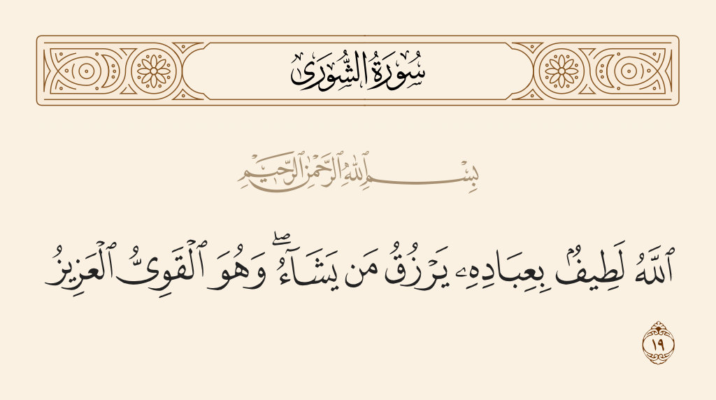 ”الله تعاليٰ پنھنجي ٻانهن کي لطف بخشيندو آھي، (۽) جنھن کي چاهي رزق ڏيندو آهي.“ (قرآن مجيد جي سورہ شوریٰ، آيت نمبر 19)